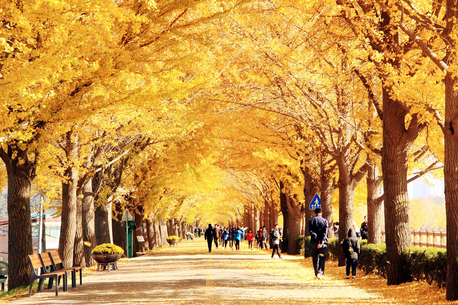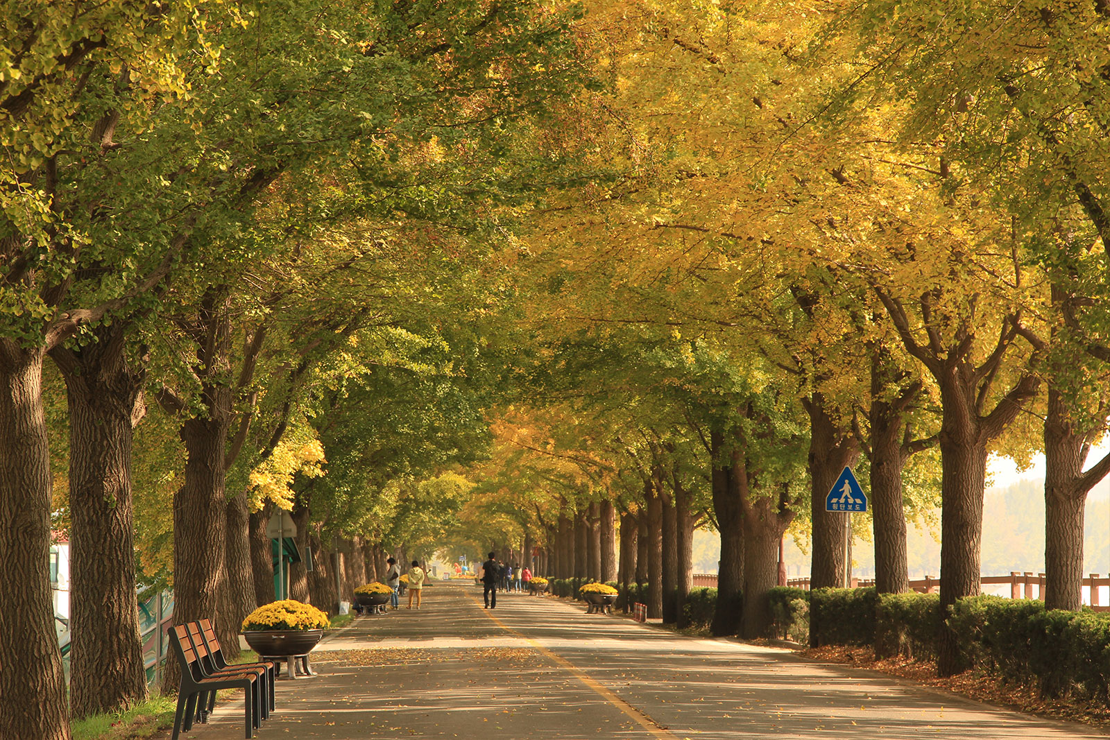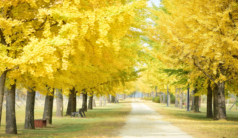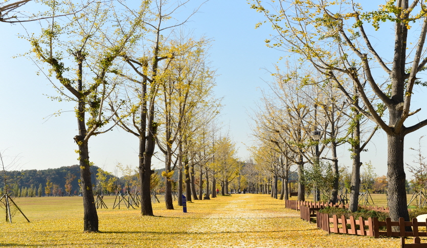 약 2.2km에 걸쳐 늘어선 은행나무가 하늘 아래로 노란 터널을 만들며, 햇살이 비칠 때마다 반짝이는 잎사귀가 마치 금빛 물결처럼 흔들립니다.
