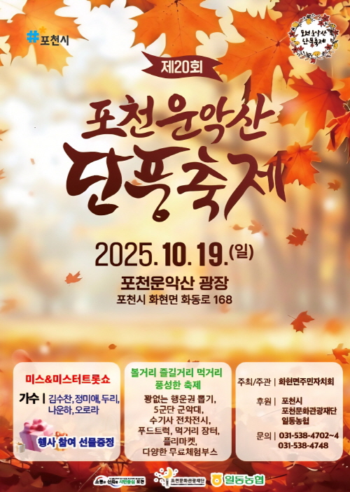 2025년 운악산 단풍축제는 10월 19일 하루 동안 열릴 예정이며, 지역 농산물 직거래 장터와 다양한 공연, 포토이벤트 등 볼거리와 즐길거리가 풍성합니다.