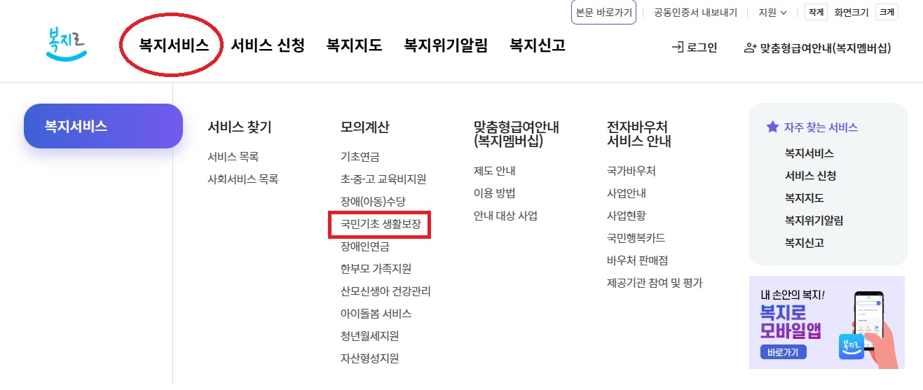 1. 복지로 사이트 접속 후 복지 서비스 항목에 "국민기초 생활 보장" 클릭