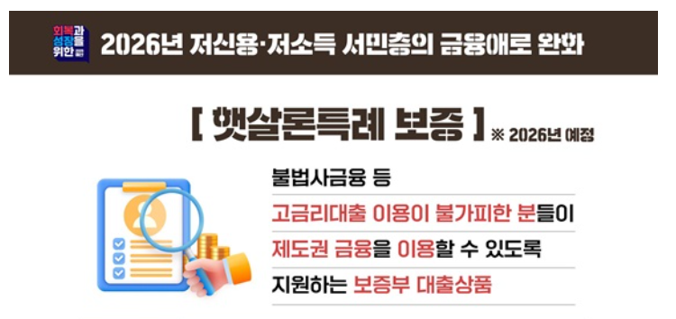 햇살론특례 보증(2026년 예정)은 불법사금융·고금리대출로 몰릴 수밖에 없는 저신용·저소득층이 제도권 금융으로 들어올 수 있게 돕는 보증부 대출입니다.